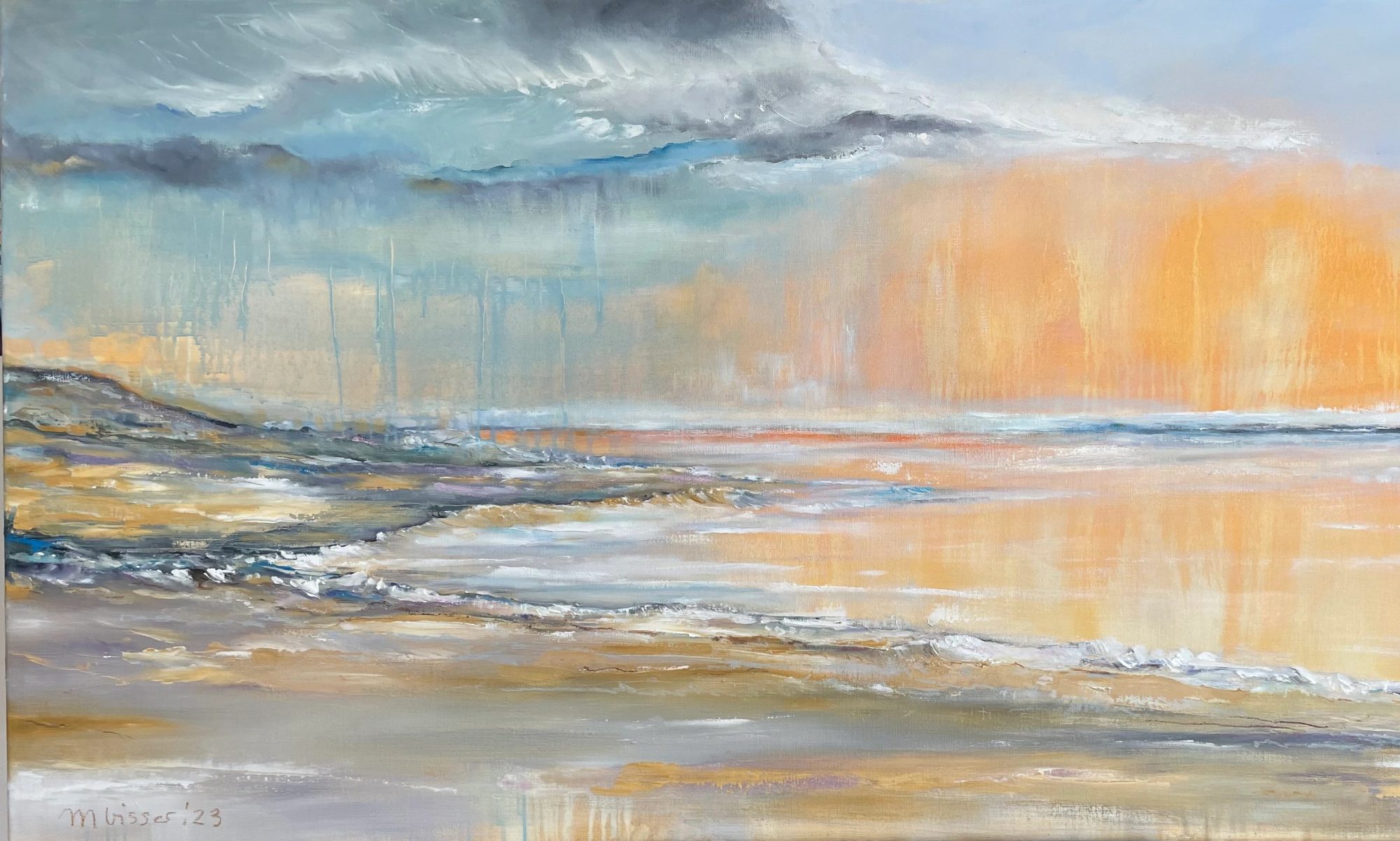 Her paintings are a quest for the essence of light and the layering of color, with which she creates complex and enchanting compositions. Her landscapes straddle the line between the figurative and the abstract. She works with oil paint and mixed media and regularly incorporates textiles into her works. These additions give her art an extra dimension, both literally and figuratively.